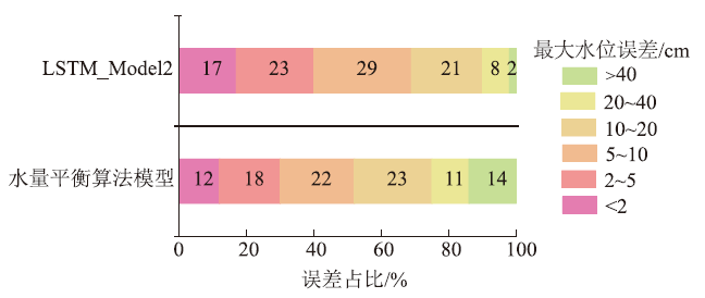 表4 水量平衡算法模型和LSTM_Model2计算三峡库区未来4 d最大最小水位平均绝对误差Table 4 Mean absolute errors of maximum and mini-mum water levels for the next four days calculated by the water balance model and LSTM_Model2 |
