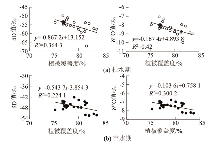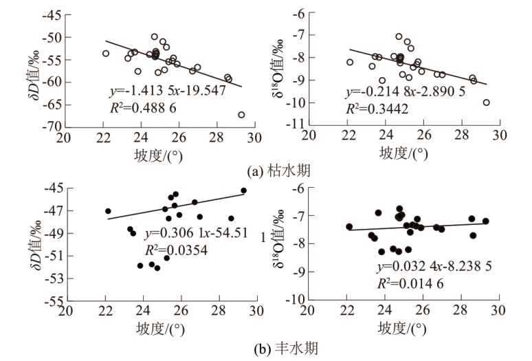 | 编号 | 位置 | 海拔/m | 坡度/(°) | 植被覆盖度/% | δ18O值/‰ | δD值/‰ | 氘盈余值/d | |||