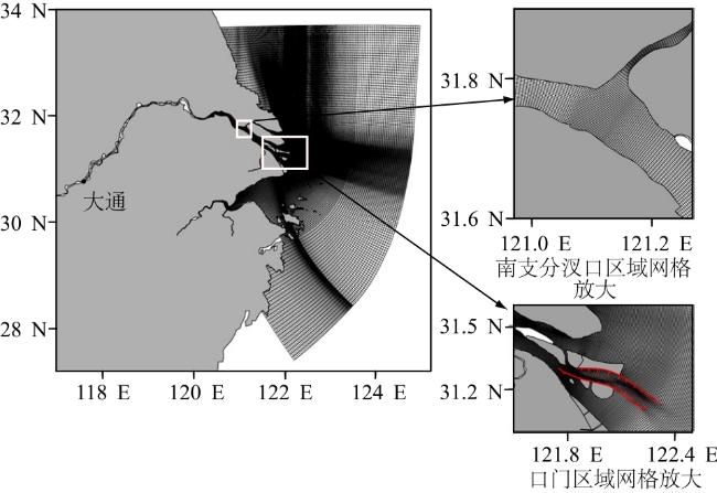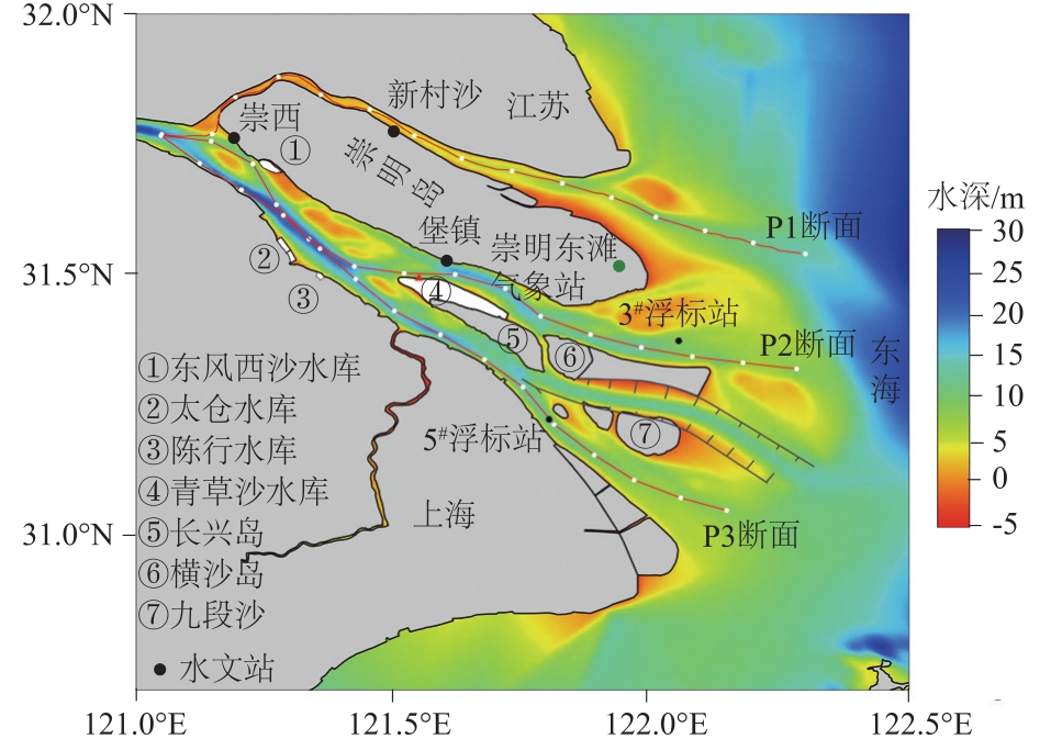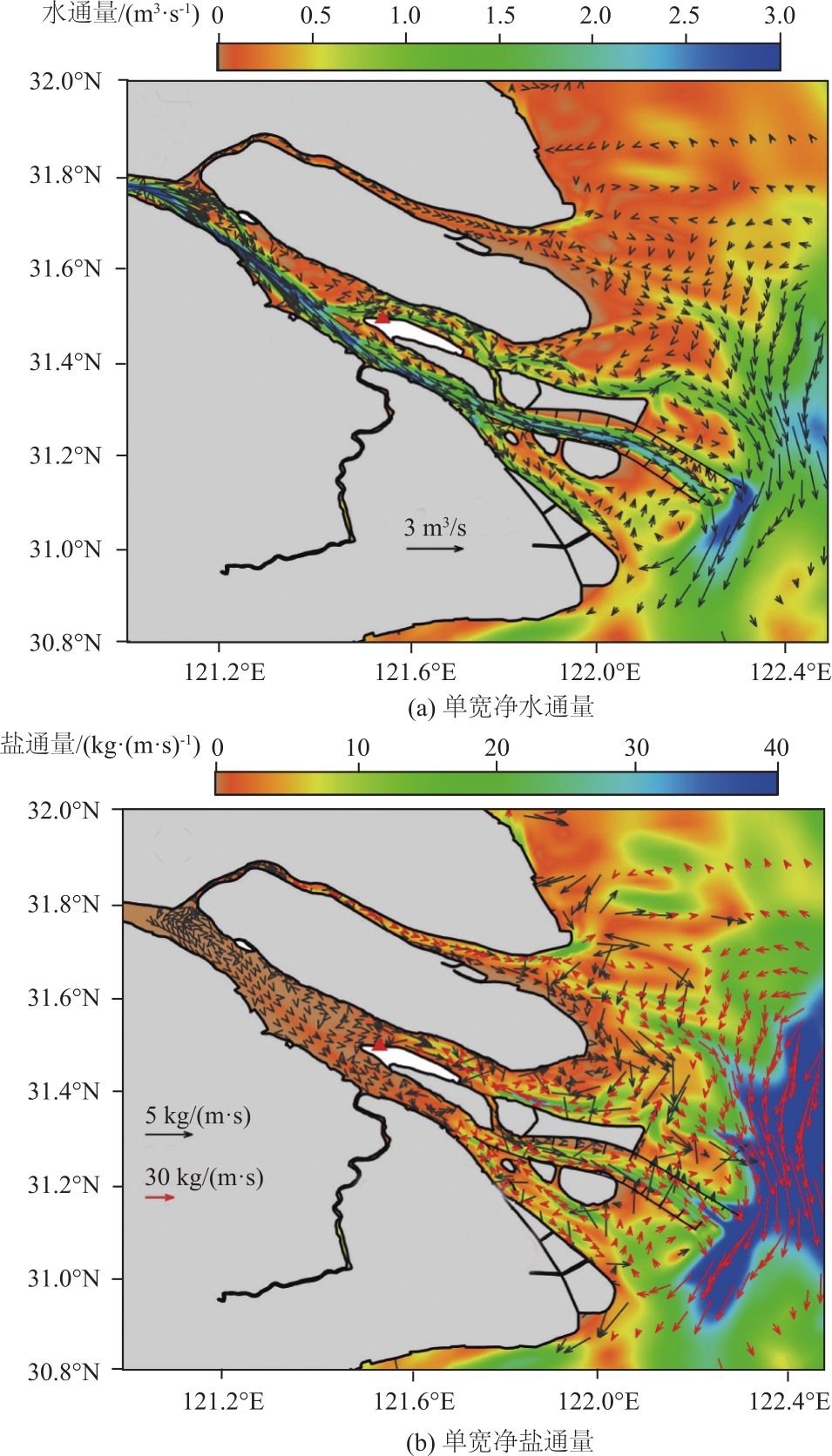 图9(a))表明北支被高盐水占据,这是因为北支为喇叭口形状,潮水进入后,随着岸线束窄潮差增加,进入北支的水量减少。北支中段盐度达27 psu,南、北支分汊口处盐度在1 psu左右,一部分高盐水团从北支倒灌进入南支,增加了南支水源地的盐度;南支上段出现盐度为1 psu的盐水团,中段盐度在0.45 psu左右,下段盐度在1 psu左右,受到北支倒灌和正面盐水入侵的影响,南支盐度整体分布呈现出高低高的格局;由于连续冷空气、台风“纳沙”、热带低压等天气系统影响,使长江口区域10月19日前后受偏北风控制,导致北港正面盐水入侵加剧,高盐水沿着北港北汊进入北港,出现较强的盐度锋面,锋面的盐度在18 psu左右,中段盐度在6 psu左右,北港上段盐度在3 psu左右,青草沙水库取水口处盐度在1.5 psu左右,从北港流出的冲淡水向东北方向扩展;南港盐度在1~3 psu之间,淡水从南港进入北槽并沿着深水航道注入外海,在科氏力的作用下向南扩展;南槽出现向陆的盐度锋面,这是由于潮流和浅滩的相互作用产生的向陆斯托克斯余流导致的。底层盐度平面分布(