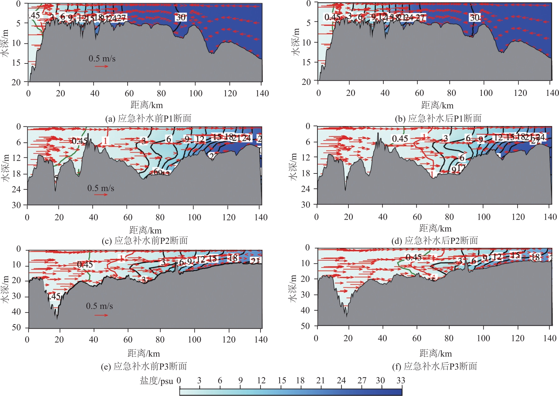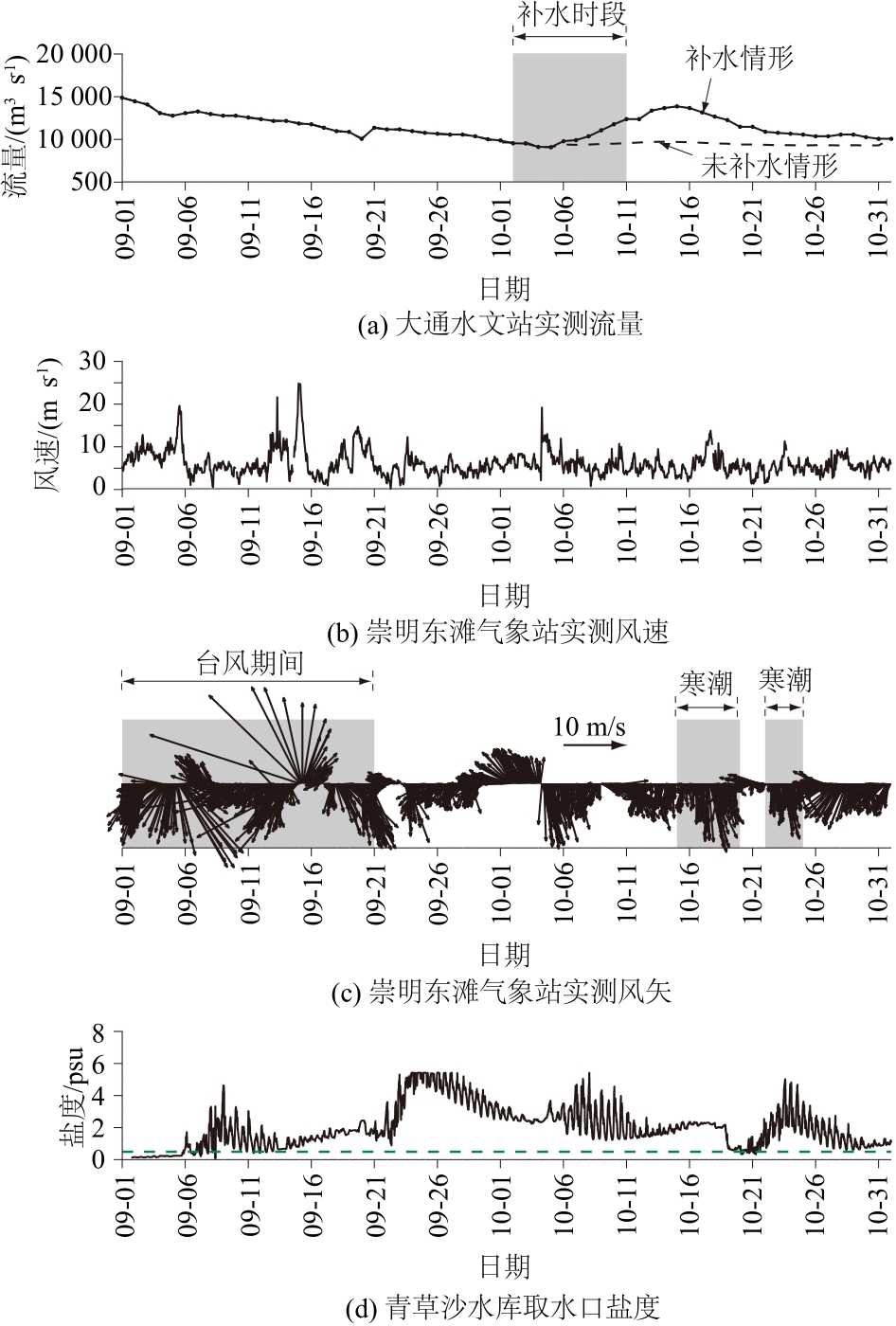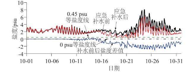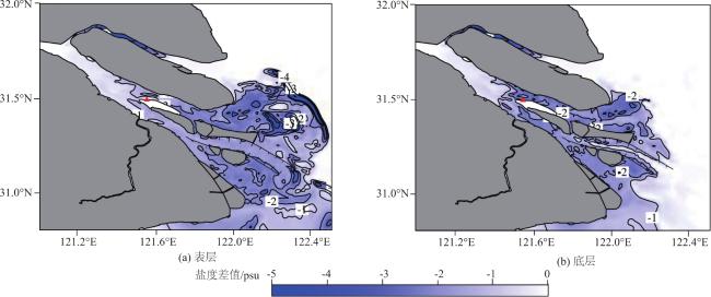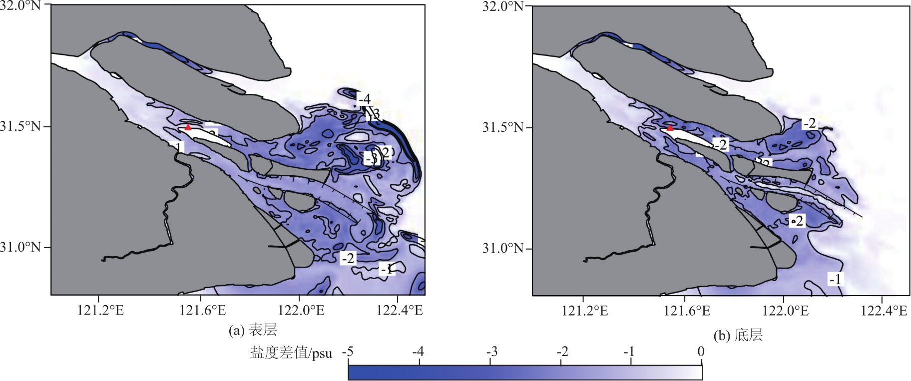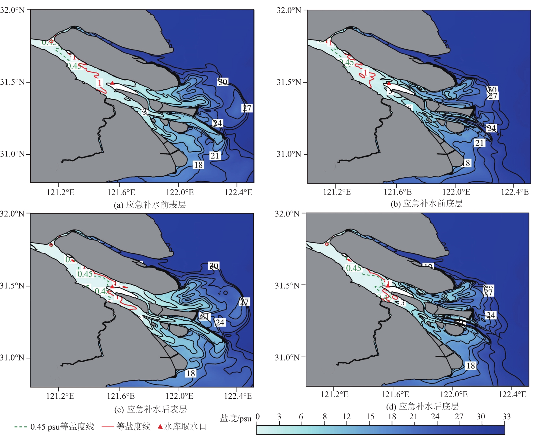 图9(d))表明,受补水压咸的影响,南支底层盐度下降明显,0.45 psu和1 psu等盐度线下移至青草沙水库取水口上侧。