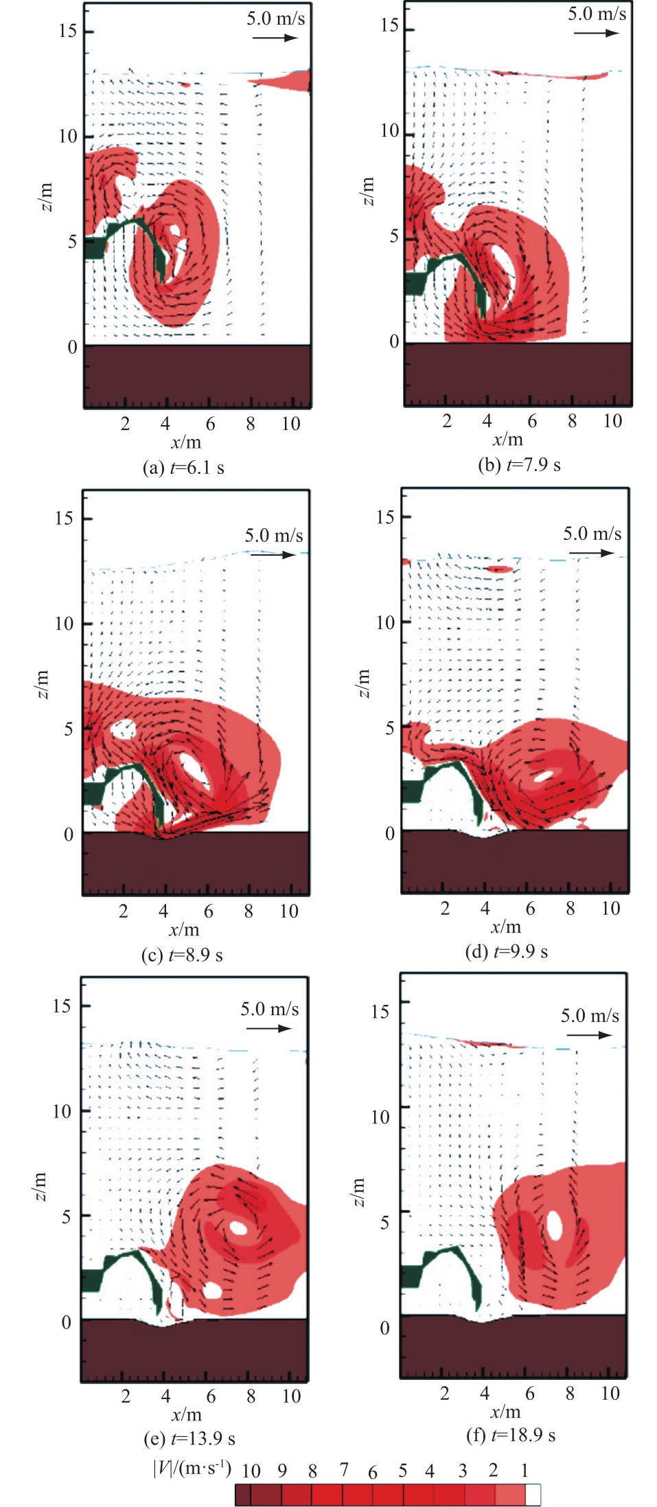 [Objectives] The sedimentation of rivers and lakes poses a persistent challenge to water resource management. Dredging, while effective for removing excess sediment and restoring channel capacity, often triggers the resuspension of contaminated bed material, leading to secondary pollution and ecological disturbance. Among various dredging techniques, grab-type dredging is widely used for its adaptability to diverse bed conditions, but its impact on local flow fields and sediment dynamics remains underexplored. This study addresses this gap by employing a full-scale two-dimensional numerical simulation using the FS3M (Fluid-Structure-Sediment-Seabed Interaction Model) to investigate the hydrodynamic and sediment suspension responses during grab bucket descent. The aim is to identify descent strategies that minimize sediment resuspension and contribute to more environmentally friendly dredging operations. [Methods] The simulation framework integrates Large Eddy Simulation (LES) for turbulent flow, a Volume of Fluid (VOF) method for water-sediment interface tracking, and a sediment transport module (STM) for modeling both suspended and bedload sediment processes. A 23 m3 environmentally friendly grab bucket is modeled descending in a symmetric two-dimensional domain that includes a 3-meter-thick sand bed. Multiple descent cases are considered: a baseline with constant velocity (1.0 m/s) and six modified cases where the grab decelerates at different heights (1.0 m, 3.0 m, 5.0 m) above the bed, with secondary descent speeds of either 0.33 m/s or 0.50 m/s. Bed deformation, flow velocity, and sediment concentration distributions are monitored over time to assess each strategy’s environmental performance. [Results] Simulation results show that the grab bucket generates significant flow disturbances during its descent, especially near the sediment bed, causing bed erosion and sediment entrainment. In the baseline scenario, rapid descent leads to high flow velocities at the bed surface and the formation of vortices that promote sediment resuspension and diffusion. In contrast, cases involving velocity reduction prior to bed contact exhibit a marked decrease in sediment disturbance. Specifically: 1)Lowering the descent speed reduces the near-bed flow velocity and suppresses the entrainment of suspended sediment. 2)Starting the deceleration at 3.0 meters above the bed (Case D3) with a reduced speed of 0.33 m/s achieves the best balance between operational efficiency and environmental performance. 3)Cases with deceleration starting at 5.0 meters do not significantly improve sediment control compared to the 3.0-meter point, suggesting diminishing returns for earlier deceleration. 4)The presence of a movable bed significantly alters flow patterns compared to fixed-bed simulations, emphasizing the importance of accounting for sediment feedback in modeling. [Conclusions] This study demonstrates that modifying the descent speed of a grab bucket is an effective way to reduce sediment resuspension during dredging operations. Key conclusions are as follows: 1)Environmental Impact Mitigation: Gradually reducing the grab’s descent speed before it reaches the sediment bed effectively decreases near-bed turbulence and sediment entrainment, thereby mitigating secondary pollution. 2)Recommended Strategy: Decelerating to one-third of the initial speed (0.33 m/s) starting at 3.0 m above the bed is the optimal descent profile among the cases studied, achieving substantial reduction in suspended sediment without compromising operational feasibility. 3)Modeling Advances: The integration of fluid, structural, and sediment dynamics through the FS3M model provides a powerful tool for analyzing complex interactions in dredging scenarios, capturing realistic behavior that conventional monitoring methods cannot resolve. 4)Future Work: Further studies should extend the modeling to include sediment excavation and lifting processes, and explore dynamic descent control strategies based on real-time sediment feedback.