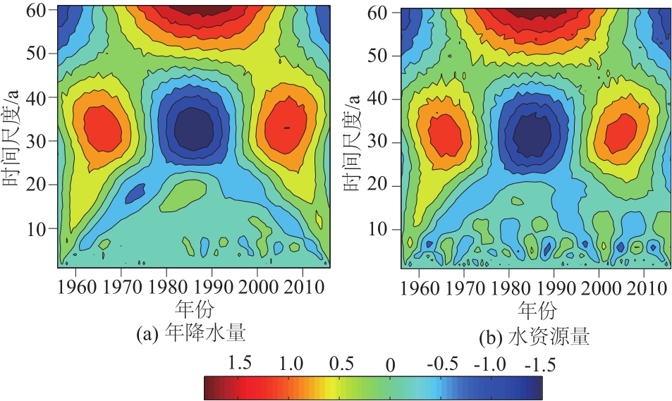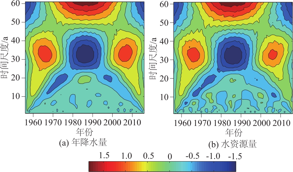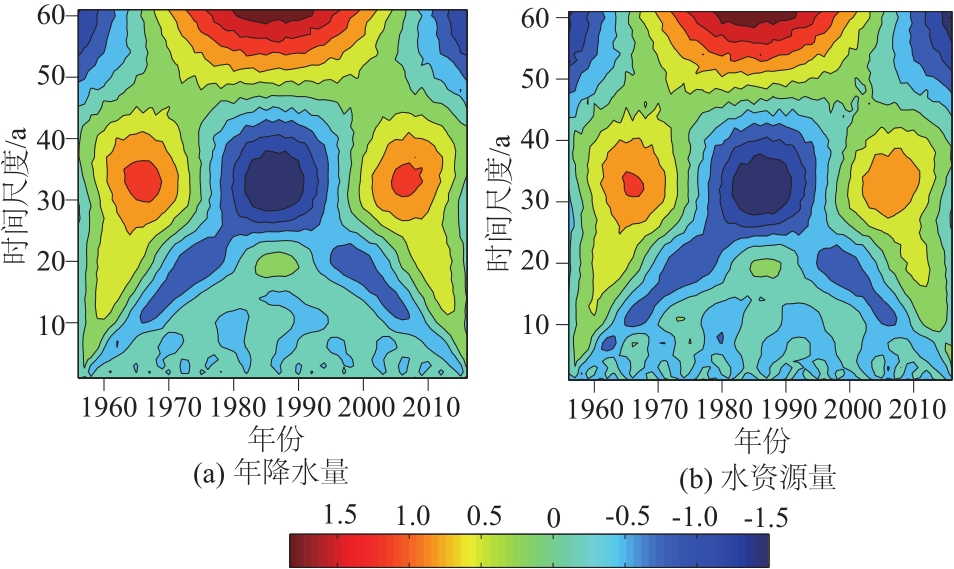 图8 怒江年降水量、水资源量小波系数等值线Fig.8 Wavelet coefficient contour map of annual precipitation and total water resources in Nu River |