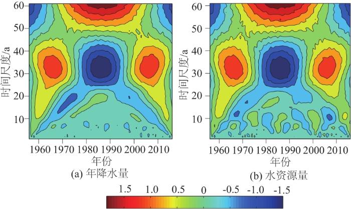 图6 保山市年降水量、水资源量小波系数等值线Fig.6 Wavelet coefficient contour map of annual precipitation and total water resources in Baoshan City |