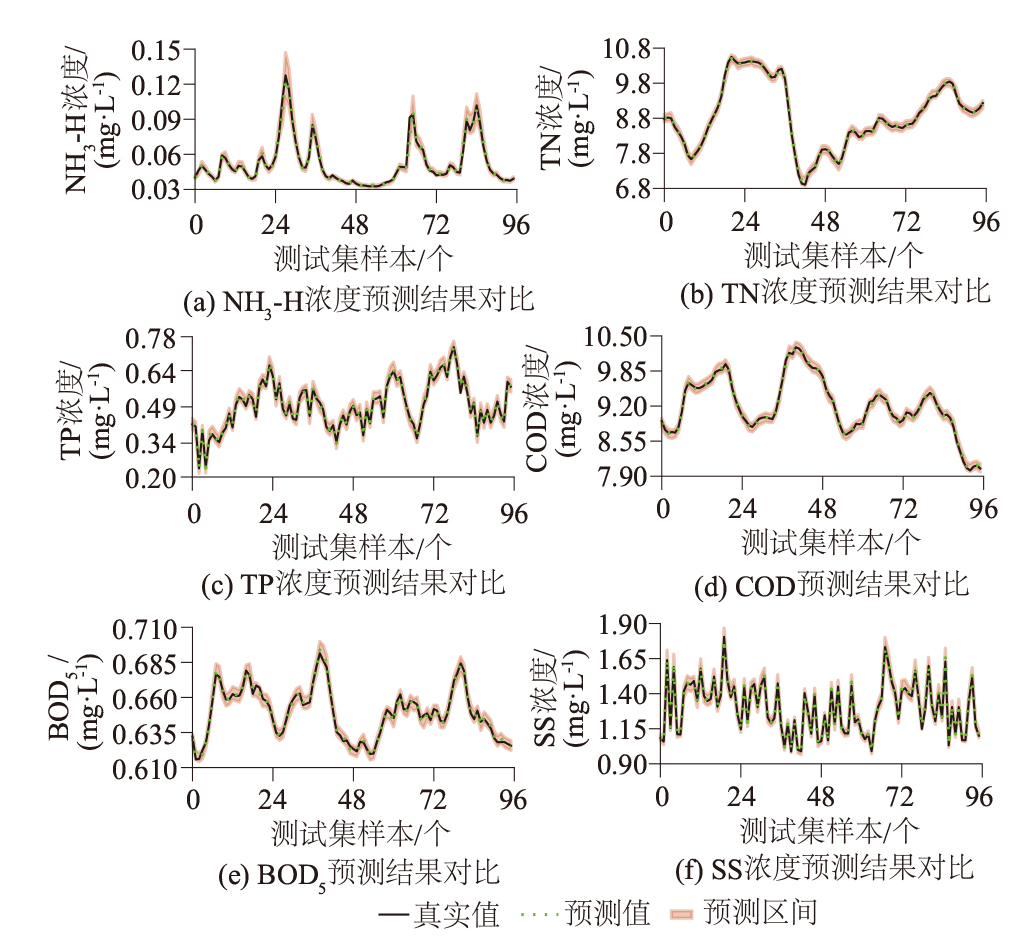 表1 高斯过程回归模型的出水水质预测精度与区间评估Table 1 Evaluation of accuracy and interval of GPR model predicted effluent water quality |